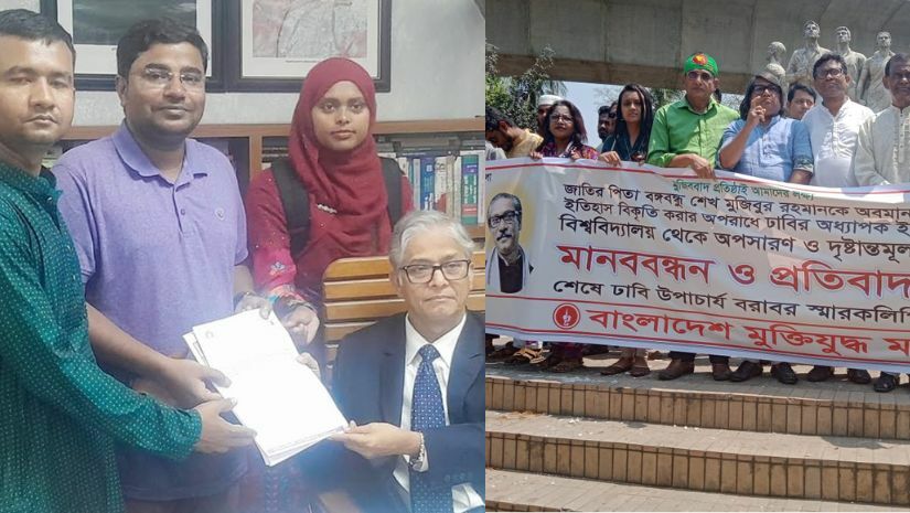 বঙ্গবন্ধুকে অবমাননা ও মুক্তিযুদ্ধের ইতিহাস বিকৃতির অভিযোগে আন্তর্জাতিক সর্ম্পক বিভাগের অধ্যাপক ড. ইমতিয়াজ আহমেদকে দৃষ্টান্তমূলক শাস্তি ও ঢাকা বিশ্ববিদ্যালয় থেকে অপসারণের দাবি জানিয়েছে বাংলাদেশ মুক্তিযুদ্ধ মঞ্চ। আজ রবিবার দুপুরে বিশ্ববিদ্যালয়ের সন্ত্রাসবিরোধী রাজু ভাস্কর্যের পাদদেশে সংগঠনটির উদ্যোগে এক মানববন্ধন ও প্রতিবাদ সমাবেশ থেকে এই দাবি জানানো হয়। পরে একই দাবিতে বিশ্ববিদ্যালয়ের উপাচার্য বরাবর স্মারকলিপিও প্রদান করা হয়। সংগঠনের সভাপতি আমিনুল ইসলাম বুলবুল ও সাধারণ সম্পাদক আল মামুনের নেতৃত্বে এই স্মারকলিপি প্রদান করা হয়।