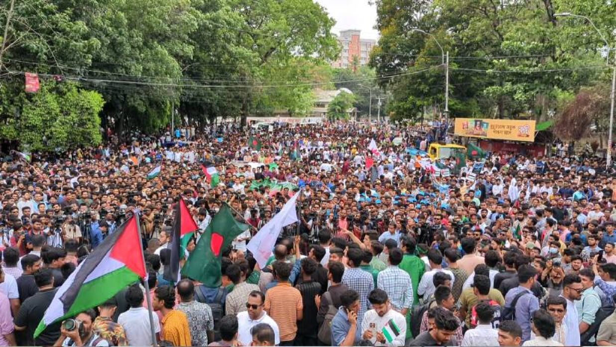 যুদ্ধ বিধ্বস্ত দেশ ফিলিস্তিনকে স্বাধীন রাষ্ট্র প্রতিষ্ঠার দাবিতে চলমান ছাত্র আন্দোলনের প্রতি সংহতি জানিয়ে বাংলাদেশের পতাকার পাশাপাশি ফিলিস্তিনের পতাকা উত্তোলন, পদযাত্রা ও সমাবেশ করেছে বাংলাদেশ ছাত্রলীগ। যা বাংলাদেশের ইতিহাসে ফিলিস্তিনিদের পক্ষে সবচেয়ে বড় প্রতিবাদ সমাবেশ। সোমবার (৬ মে) দুপুর ১২টায় ঢাকা বিশ্ববিদ্যালয়ের (ঢাবি) সন্ত্রাস বিরোধী রাজু ভাস্কর্যের সামনে প্রায় দশ থেকে পনেরো হাজার শিক্ষার্থীর সমাগমে এই প্রতিবাদ সমাবেশ অনুষ্ঠিত হয়।