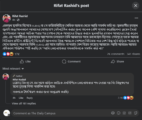 পোস্টে রিফাত রশিদ লিখেছেন, ‘একজন মুসলিম হিসেবে এলজিবিটিকি বা গে কমিউনিটিকে নৈতিক জায়গা থেকে আমি সমর্থন করি না। মুনতাসীর রহমান জুলাই অভ্যুত্থানকালে আমাদের যোগাযোগ মেইনটেইন করার জন্য অনেক বেশি সাহায্য করেছিলেন। কুয়েত মৈত্রী হাসপাতালে আমরা আটকা পরার পর সেখান থেকে আমাদের উদ্ধার করতে মুনতাসির রহমান আমাদের হেল্প করেন এবং এর পরবর্তীতেও জুলাইয়ের আন্দোলন চলাকালে উনি আমাদের সাথে কানেক্টেড ছিলেন।’