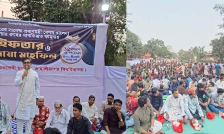 তিনি আরও বলেন, 'আজকের এই ইফতার মাহফিল থেকে বিশ্ববিদ্যালয়ের প্রতি এবং বিশ্ববিদ্যালয় কর্তৃপক্ষের প্রতি আমাদের জোরালো দাবি এই রমজানের মধ্যে, ঈদের ছুটির পর যেন কোনো ফ্যাসিবাদের দোসর কর্মকর্তা-কর্মচারী বিশ্ববিদ্যালয়ে না আসেন। যদি আসে, তাহলে সাধারণ শিক্ষার্থীদের নিয়ে ড্যাফোডিল বিশ্ববিদ্যালয় ছাত্রদল তাদের প্রতিহত করবে। বৈষম্যহীন, সাম্যভিত্তিক ও মানবিক ড্যাফোডিল বিশ্ববিদ্যালয় ক্যাম্পাস বিনির্মাণে ড্যাফোডিল বিশ্ববিদ্যালয় ছাত্রদল প্রতিজ্ঞাবদ্ধ।'