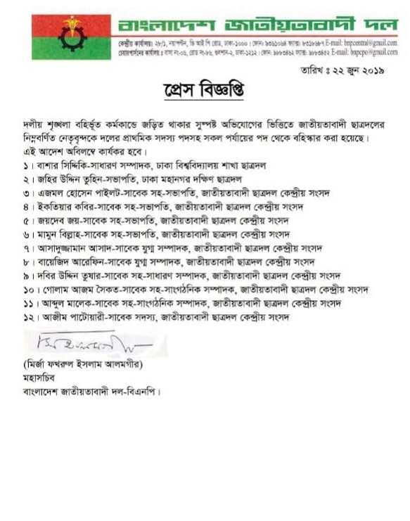ছাত্রদলের সাবেক ও বর্তমান ১২জন নেতাকে বহিষ্কার করেছে জাতীয়তাবাদী দল বিএনপি। আজ শনিবার দলের মহাসচিব মির্জা ফখরুল ইসলাম আলমগীরের স্বাক্ষরে তাদেরকে দলের সব ধরণের কার্যক্রম থেকে অব্যাহতি দেওয়া হয়। আদেশে বলা হয়, শৃঙ্খলা বহির্ভূত কর্মকান্ডে জড়িত থাকার সুস্পষ্ট অভিযোগের ভিত্তিতে সংশ্লিষ্টদের দলের প্রাথমিক সদস্য পদসহ সকল পর্যায়ের পদ থেকে বহিস্কার করা হলো।