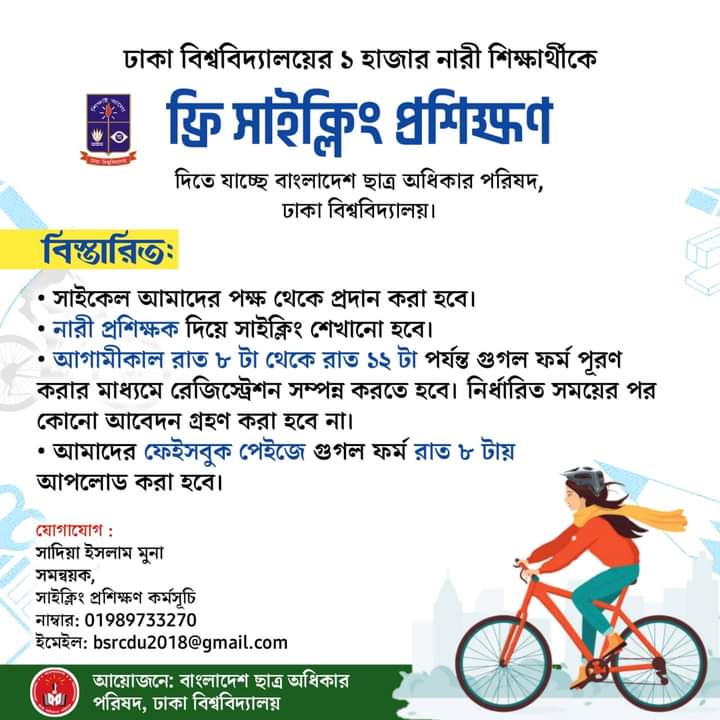 ঢাকা বিশ্ববিদ্যালয়ের (ঢাবি) এক হাজার নারী শিক্ষার্থীকে সাইক্লিং প্রশিক্ষণ দেবে বাংলাদেশ ছাত্র অধিকার পরিষদ। সংগঠনটির বিশ্ববিদ্যালয় শাখার উদ্যোগে মঙ্গলবার (১৬ নভেম্বর) রাত ৮টা থেকে ১২টা পর্যন্ত অনলাইনে গুগল ফর্ম পূরণ করার মাধ্যমে রেজিস্ট্রেশন সম্পন্ন করা হবে। এরপর নারী প্রশিক্ষক দিয়ে সাইক্লিং শেখানো হবে।