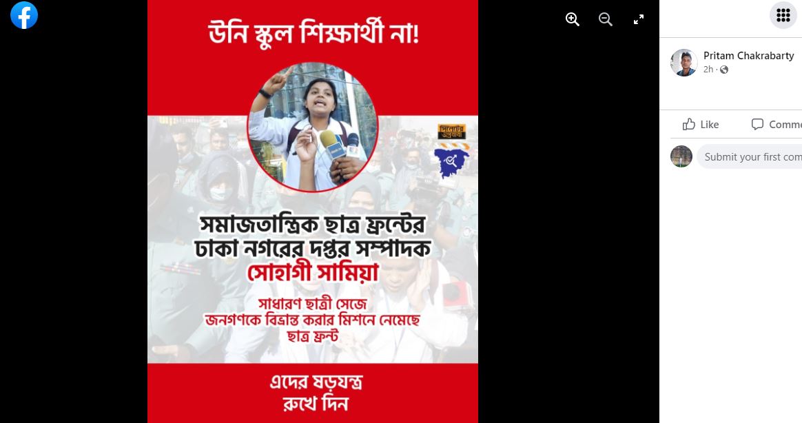 এই ক্যাপশন কেন্দ্র করে বেশ কিছু ফেসবুক ব্যবহারকারী দাবি করেছেন, পুলিশের সঙ্গে বিতণ্ডায় জড়ানো দুই কিশোরী ‘শিক্ষার্থী’ নন। তারা শিক্ষাপ্রতিষ্ঠানের ইউনিফর্ম পরে আন্দোলনে উস্কানি দিচ্ছেন। তাদের দাবি, সোহাগী একটি রাজনৈতিক দলের নেত্রী। শিক্ষার্থী আন্দোলন স্থগিত করলেও স্কুলের ইউনিফর্ম পরে রাস্তায় নেমে উস্কানি দিচ্ছেন সোহাগী।