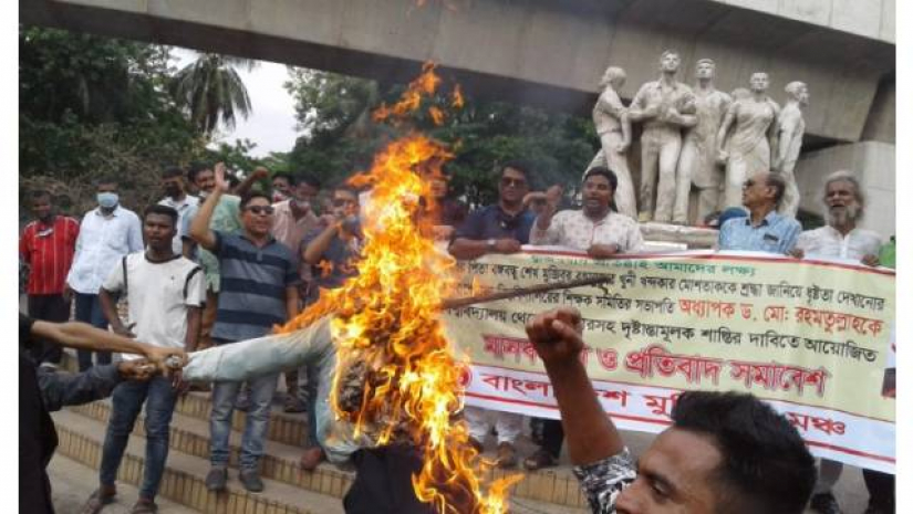 ঢাবি শিক্ষক সমিতির সভাপতির কুশপুত্তলিকা দাহ করল মুক্তিযুদ্ধ মঞ্চ