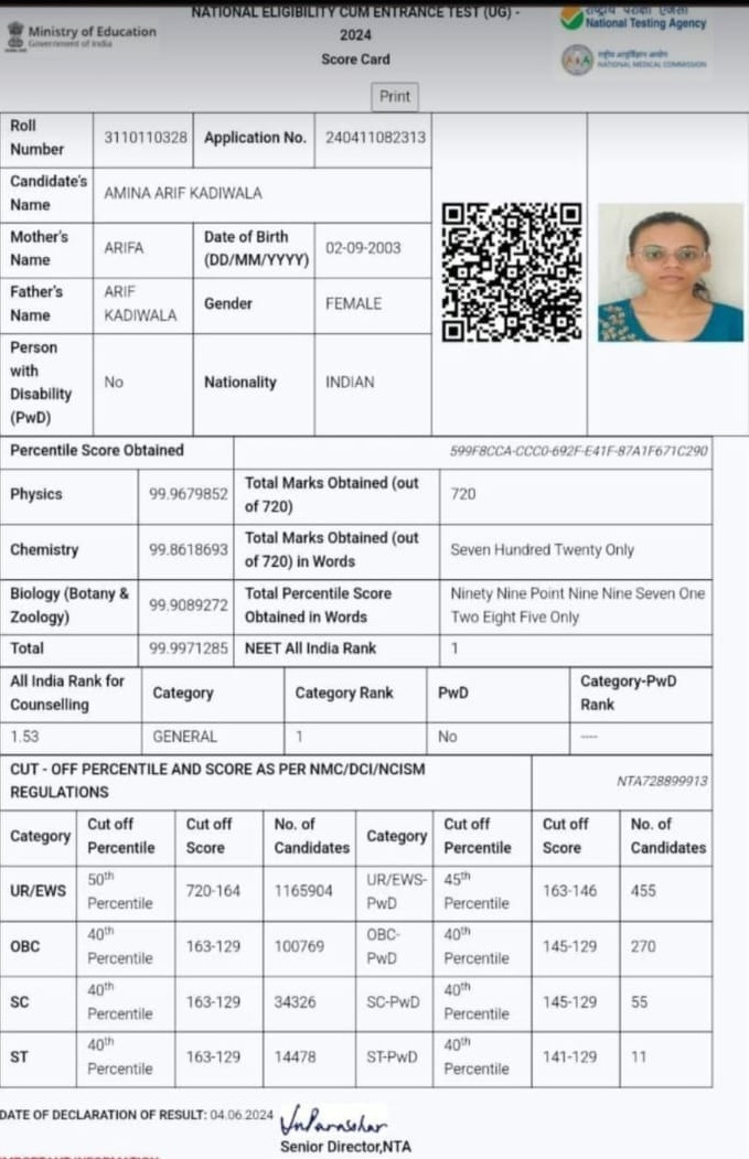 ২০২৪ সালে সর্বভারতীয় মেডিকেল ভর্তি পরীক্ষায় (নীট-ইউজি) ৭২০ নম্বরে ৭২০ পেয়ে প্রথম স্থান অধিকার করেছেন মুম্বইয়ের আমিনা আরিফ কাদিওয়ালা। অবশ্য আমিনা ছাড়াও এ পরীক্ষায় সমান নম্বর পেয়ে প্রথম হয়েছেন আরও ৬৬ জন শিক্ষার্থী। তাদের মধ্যে তিনজন পশ্চিমবঙ্গ রাজ্যের। সবথেকে বেশি ১১ জন করে আছেন উড়িষ্যা ও রাজস্থানের।