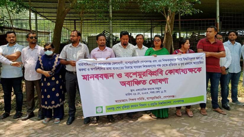 শিক্ষকদের নিয়ে বির্তকিত মন্তব্যের জেরে গোপালগঞ্জের বঙ্গবন্ধু শেখ মুজিবুর রহমান বিজ্ঞান ও প্রযুক্তি বিশ্ববিদ্যালয়ের (বশেমুরবিপ্রবি) কোষাধ্যক্ষ অধ্যাপক ড. মোবারক হোসেনকে অবাঞ্ছিত ঘোষণা করেছে শিক্ষক সমিতি। সোমবার (২৯ মে) দুপুরে বিশ্ববিদ্যালয়ের একাডেমিক ভবনের সামনে এই মানববন্ধনে অংশ নেন প্রায় শতাধিক শিক্ষক। এসময় কোষাধ্যক্ষকে বিশ্ববিদ্যালয়ের সকল প্রশাসনিক কার্যক্রমে অবাঞ্ছিত ঘোষণা করেন সমিতির নেতারা।