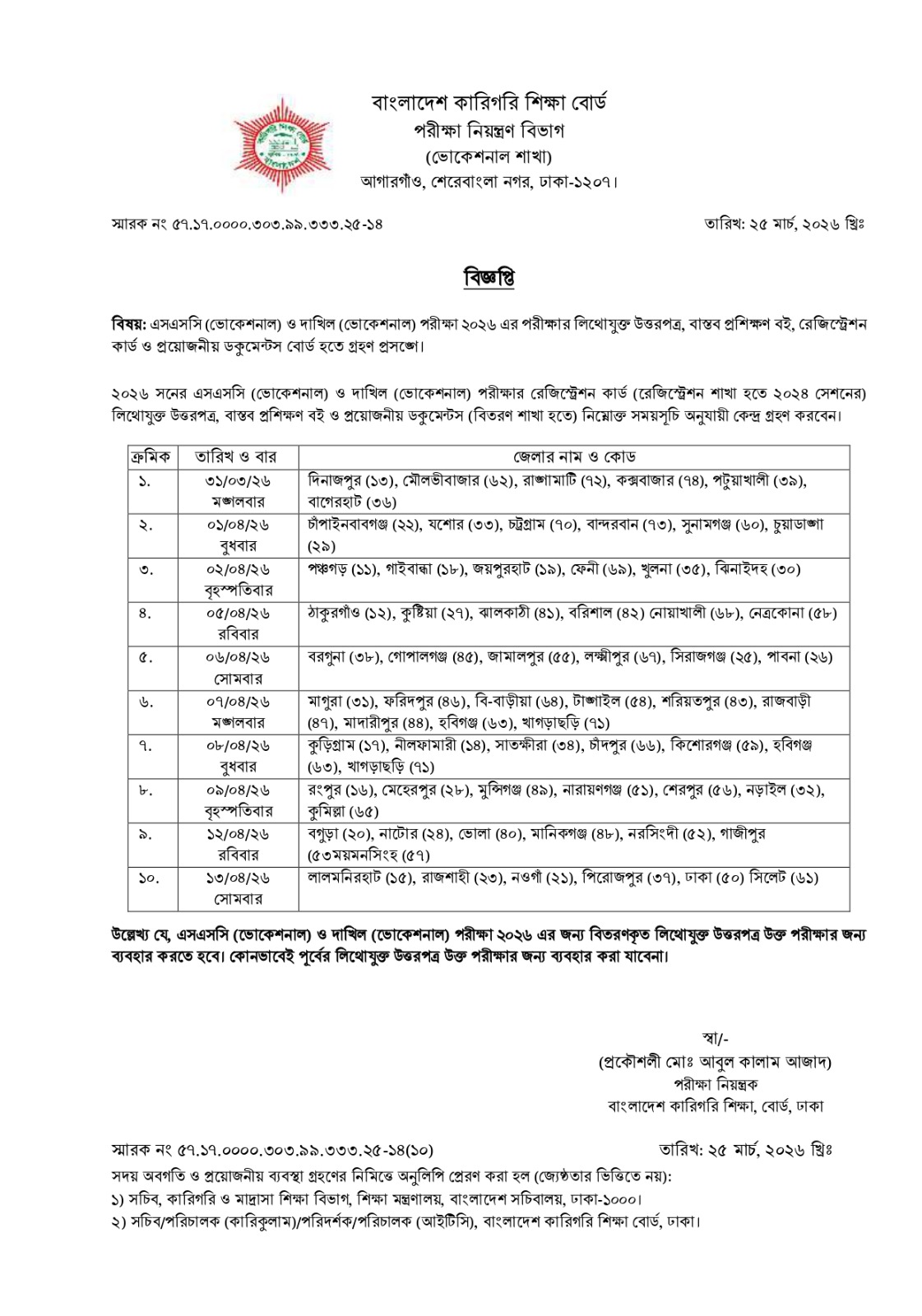 বিজ্ঞপ্তিতে বলা হয়, এসএসসি (ভোকেশনাল) ও দাখিল (ভোকেশনাল) পরীক্ষা ২০২৬ এর জন্য বিতরণকৃত লিথোযুক্ত উত্তরপত্র উক্ত পরীক্ষার জন্য ব্যবহার করতে হবে। কোনভাবেই পূর্বের লিথোযুক্ত উত্তরপত্র উক্ত পরীক্ষার জন্য ব্যবহার করা যাবেনা।