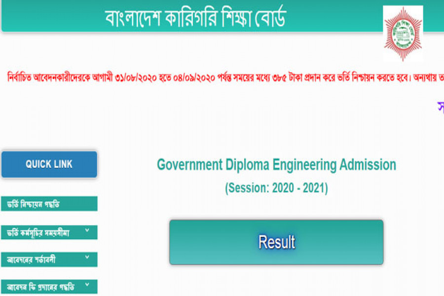 ২০২০-২১ শিক্ষাবর্ষে সরকারি পলিটেকনিক ইনস্টিটিউট, টেকনিক্যাল স্কুল এন্ড কলেজ এবং বাংলাদেশ ইনস্টিটিউট অব মেরিন টেকনোলজিতে ডিপ্লোমা ইন ইঞ্জিনিয়ারিং কোর্সে ভর্তি হওয়ার জন্য প্রথম দফায় মনোনীত শিক্ষার্থীদের তালিকা প্রকাশ করা হয়েছে। আজ রবিবার বিকেলে বাংলাদেশ কারিগরি বোর্ডের ওয়েবসাইটে এ ফল প্রকাশ করা হয়।