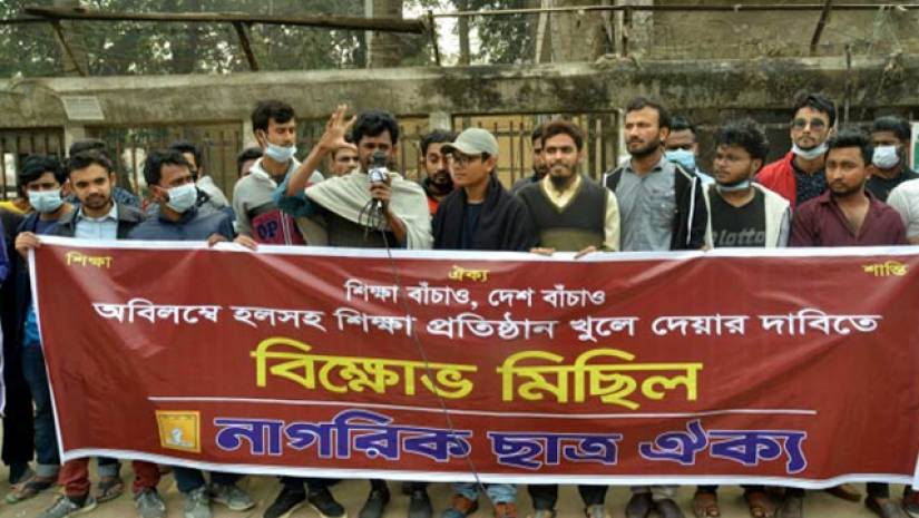 সমাবেশে নাগরিক ছাত্র ঐক্যের ভারপ্রাপ্ত সভাপতি মোশাররফ হোসেন অবিলম্বে হলসহ শিক্ষাপ্রতিষ্ঠান খুলে দেওয়ার দাবি জানিয়ে বলেন, হল খুলে না দিয়ে ঢাকা বিশ্ববিদ্যালয়সহ অন্যান্য বিশ্ববিদ্যালয়ে পরীক্ষা নেওয়ার সিদ্ধান্ত ভুল৷ জানুয়ারির মধ্যে শিক্ষার্থীদের তালিকা করে প্রত্যেকের ভ্যাকসিন নিশ্চিত করে ফেব্রুয়ারির শুরুতে শিক্ষাপ্রতিষ্ঠান খুলে দিতে হবে৷ অন্যথায় কঠোর আন্দোলন করা হবে৷