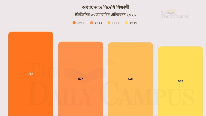ইউজিসির প্রতিবেদন অনুযায়ী, ২০২৩ সালে দেশের ৫৩টি পাবলিক বিশ্ববিদ্যালয়ের মধ্যে ২১টি বিশ্ববিদ্যালয়ে অধ্যয়নরত বিদেশি শিক্ষার্থীর সংখ্যা ৬৩৩ জন। ২০২২ সালে এ সংখ্যা ছিল ৬৭০ জন। সেই হিসেবে ২০২২ সালের তুলনায় ২০২৩ সালে বিদেশি শিক্ষার্থীর সংখ্যা হ্রাস পেয়েছে ৩৭ জন। আর ২০২১ সালে করোনার প্রাদুর্ভাবের পর এই সংখ্যা ছিল ৬৭৭ জন। অর্থাৎ, ধারাবাহিকভাবে পাবলিক বিশ্ববিদ্যালয়ে কমছে বিদেশি শিক্ষার্থী। তবে ২০২০ সালে করোনার সময়কালে এই সংখ্যা ছিল ৭৬৭ জন। যা চার বছরে সর্বোচ্চ।