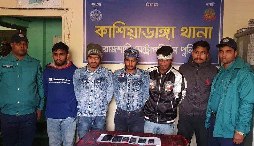 অপরদিকে গ্রেফতার হওয়া ৫ যুবক হলেন রাজশাহী মহানগরীর বোয়ালিয়া মডেল থানার রানীনগর হিন্দুপাড়ার শ্রী ইন্দ্রজিৎ সরকারের ছেলে পবন সরকার উদয় (১৯), রাজপাড়া থানার হড়গ্রাম বাজার এলাকার মৃত সাইদুল ইসলামের ছেলে মো. দাউদ ইব্রাহিম সাফি (২২), একই এলাকার মৃত সুরে জামাল শেখের ছেলে মো. পলাশ কবির (২৬), কাশিয়াডাঙ্গা থানার হড়গ্রাম পালপাড়ার শ্রী হরেন্দ্রনাথ পালের ছেলে প্রবীন পাল রুদ্র (২০) ও একই এলাকার মো. শামসুর রহমান বাদলের ছেলে ওয়াহিদুর রহমান নুর (২০)।