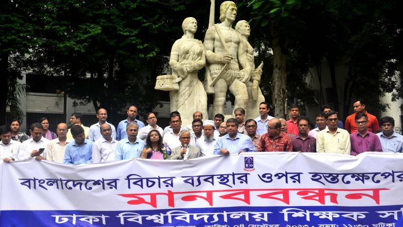 আজ সোমবার (৪ সেপ্টেম্বর) দুপুরে ঢাকা বিশ্ববিদ্যালয়ের অপরাজেয় বাংলার পাদদেশে আয়োজিত এক মানববন্ধনে এসব কথা বলেন অধ্যাপক আখতারুজ্জামান। ড. ইউনূসের পক্ষে বিবৃতি দিয়ে ১৬০ জন আন্তর্জাতিক ব্যক্তিত্ব বাংলাদেশের বিচার ব্যবস্থার ওপর হস্তক্ষেপ করেছেন দাবি করে এই ঘটনার প্রতিবাদে ঢাকা বিশ্ববিদ্যালয় শিক্ষক সমিতি মানববন্ধনের আয়োজন করে।