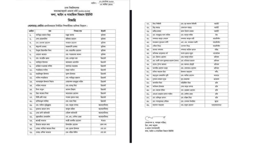 ঢাকা বিশ্ববিদ্যালয়ে (ঢাবি) স্নাতক ও স্নাতকোত্তর পর্যায়ে ভর্তিতে অবশ্যই পরীক্ষায় বসতে হয় ভর্তিচ্ছু শিক্ষার্থীদের। এরপর নিদির্ষ্ট স্কোরের ভিত্তিতে মেধাতালিকা থেকে বিশ্ববিদ্যালয়ে ভর্তির সুযোগ পেয়ে থাকেন তারা। তবে চলতি ২০২২-২৩ শিক্ষাবর্ষে বিশ্ববিদ্যালয়ে আন্ডার গ্র্যাজুয়েট প্রোগ্রামে ভর্তির জন্য কলা, আইন ও সামাজিক বিজ্ঞান ইউনিট থেকে কোনো পরীক্ষা ছাড়াই ভর্তি সুযোগ পেয়েছেন ৪৯ জন শিক্ষার্থী। সম্প্রতি এসব শিক্ষার্থীর তালিকা প্রকাশ করে বিশ্ববিদ্যালয় কর্তৃৃপক্ষ।