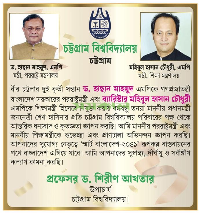 চট্টগ্রাম থেকে মন্ত্রিত্ব পাওয়া ড. হাছান মাহমুদ (পররাষ্ট্রমন্ত্রী) ও মহিবুল হাসান চৌধুরীকে (শিক্ষামন্ত্রী) অভিনন্দন ও শুভেচ্ছা জানিয়ে কয়েকটি দৈনিক পত্রিকায় বিজ্ঞাপন দিয়েছে চট্টগ্রাম বিশ্ববিদ্যালয় (চবি) কর্তৃপক্ষ। বিশ্ববিদ্যালয়ের পক্ষ থেকে ভিসি প্রফেসর ড. শিরীণ আখতার এই অভিনন্দন ও শুভেচ্ছা জানিয়ে আজ বুধবার কয়েকটি জাতীয় দৈনিকে এই বিজ্ঞাপন দেয়া হয়েছে।