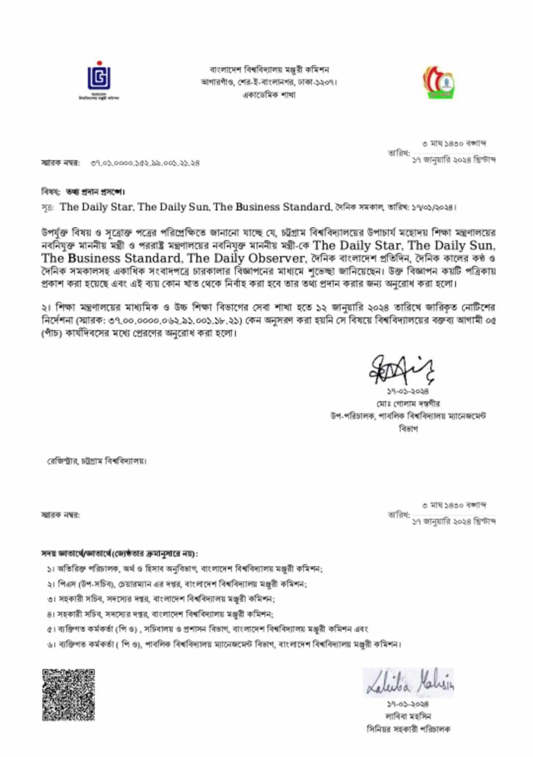 চবি ভিসি ও পত্রিকায় বিজ্ঞাপন