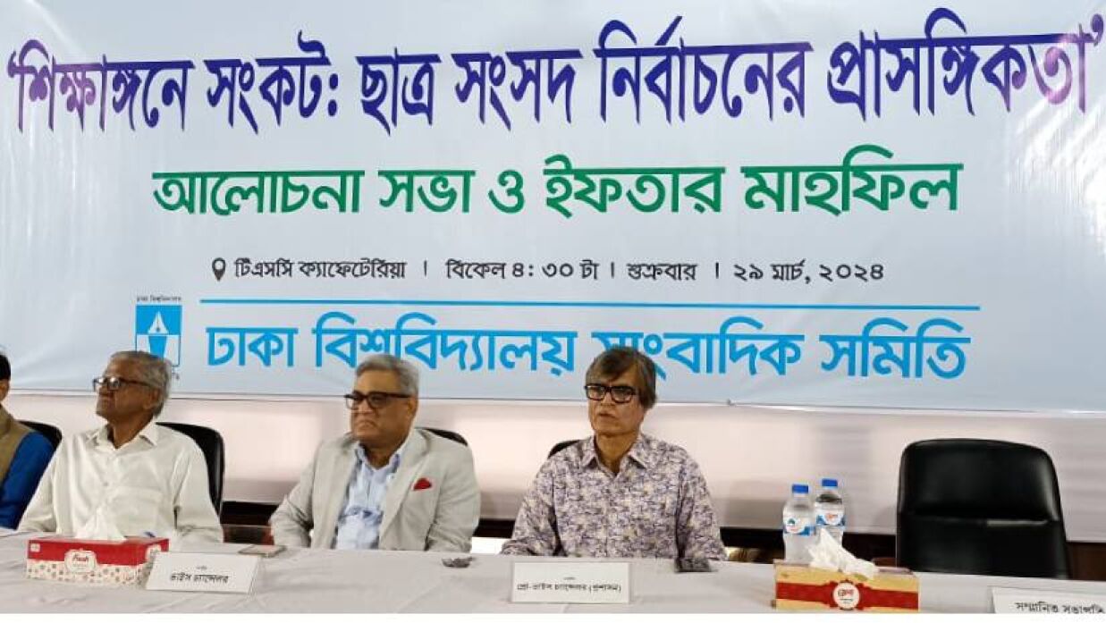 শুক্রবার (২৯ মার্চ) বিকেলে বিশ্ববিদ্যালয়ের টিএসসি ক্যাফেটেরিয়ায় ‘শিক্ষাঙ্গনে সংকট: ছাত্র সংসদ নির্বাচনের প্রাসঙ্গিকতা’ শীর্ষক এক আলোচনা সভা ও ইফতার মাহফিলে প্রধান অতিথির বক্তব্যে তিনি এসব কথা বলেন। ঢাকা বিশ্ববিদ্যালয় সাংবাদিক সমিতি এ অনুষ্ঠানের আয়োজন করে।