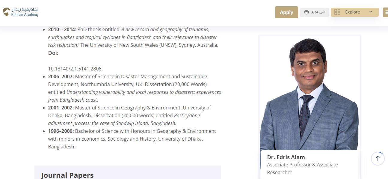 অন্যদিকে, সংযুক্ত আরব আমিরাতের (ইউএই) রাবাদান অ্যাকাডেমির অফিসিয়াল ওয়েবসাইটে গিয়ে দেখা গেছে, উচ্চশিক্ষালয়টির ইন্টিগ্রেটেড ইমার্জেন্সি ম্যানেজমেন্ট বিভাগের সহযোগী অধ্যাপক এবং সহযোগী গবেষক হিসেবে কর্মরত রয়েছেন তিনি। একই সাথে বিশ্ববিদ্যালয়ের ওয়েবসাইটে তার প্রোফাইলে দীর্ঘ কর্ম অভিজ্ঞতা এবং গবেষণাসহ সংশ্লিষ্ট সব তথ্য প্রদর্শন করা হচ্ছে।