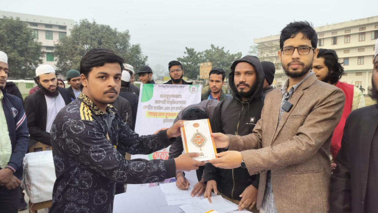 ষড়যন্ত্রমূলকভাবে রাজশাহী বিশ্ববিদ্যালয় (রাবি) কেন্দ্রীয় মসজিদ ও আবাসিক হলগুলোতে পবিত্র কোরআন শরীফ পোড়ানোর প্রতিবাদে কোরআন শরীফ বিতরণ করেছে শাখা ছাত্রশিবির। বুধবার (২২ জানুয়ারি) বিশ্ববিদ্যালয়ের বিভিন্ন স্থানে এই কোরআন বিতরণ করা হয়। এদিন বিকাল ৪টা ৪৫ মিনিট থেকে ৫টা ৪৫ মিনিট পর্যন্ত এই বিতরণ কর্মসূচি পালন করেন তারা।