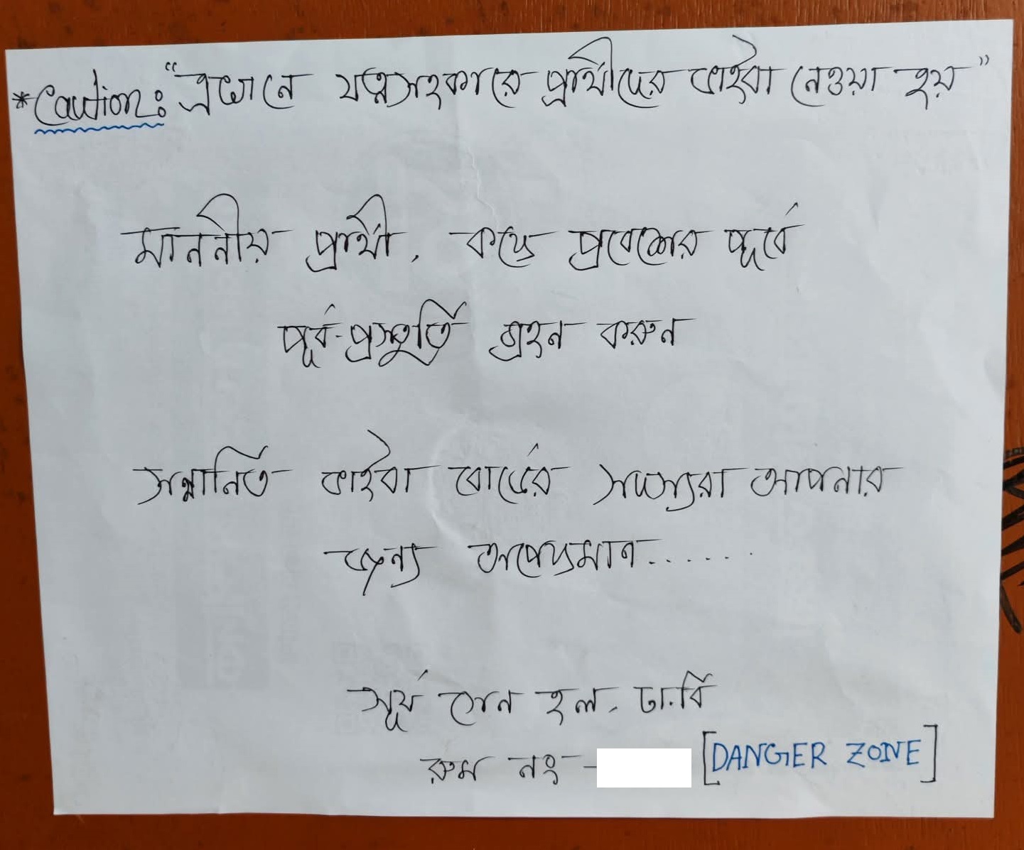 তেমনই একটি ছবি সামাজিক যোগাযোগমাধ্যমে ছড়িয়ে পড়েছে। এতে প্রার্থীদের সতর্ক করে লেখা হয়েছে, ‘এখানে যত্নসহকারে প্রার্থীদের ভাইভা নেওয়া হয়। মাননীয় প্রার্থী, কক্ষে প্রবেশের পূর্বে পূর্ব-প্রস্তুতি গ্রহণ করুন। সম্মানিত ভাইভা বোর্ডের সদস্যরা আপনার জন্য অপেক্ষমান...।’ সবশেষে লেখা হয়েছে ‘ডেঞ্জার জোন’।