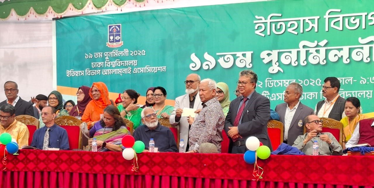 ঢাকা বিশ্ববিদ্যালয়ের (ঢাবি) ইতিহাস বিভাগ অ্যালামনাই অ্যাসোসিয়েশনের ১৯তম পুনর্মিলনী উৎসবমুখর পরিবেশে অনুষ্ঠিত হয়েছে। শুক্রবার (১২ ডিসেম্বর) বিশ্ববিদ্যালয়ের ছাত্র-শিক্ষক কেন্দ্রে (টিএসসি) দিনব্যাপী এই অনুষ্ঠানটি আয়োজন করা হয়। পুনর্মিলনীতে সভাপতিত্ব করেন অধ্যাপক ড. আহমেদ কামাল। তিনি আনুষ্ঠানিকভাবে এই অনুষ্ঠানের উদ্বোধন ঘোষণা করেন। এতে বিভাগের প্রাক্তন শিক্ষার্থী, শিক্ষক ও আমন্ত্রিত অতিথিরা অংশগ্রহণ করেন।