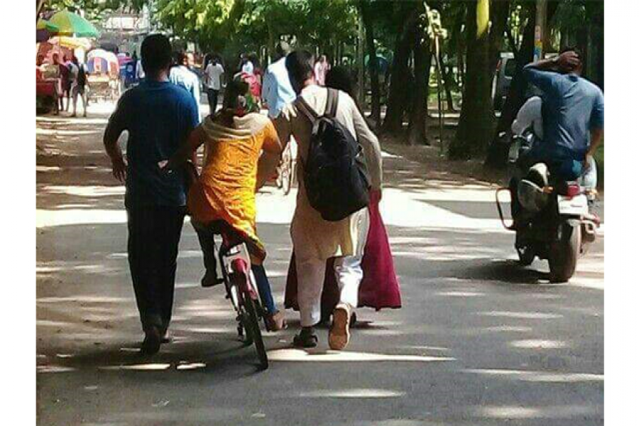 সরেজমিন দেখা দেছে, বিশ্ববিদ্যালয়ের প্রশাসনিক ভবন সংলগ্ন মালরো চত্ত্বরে দুই জন ধরে এক ছাত্রীকে সাইকেল চালানো শিখাচ্ছেন। একটু এগিয়ে গিয়ে মাস্টার’দা সূর্য সেন হল সংলগ্ন রাস্তায় যুগলের একজনকে চালানো শিখাচ্ছেন অন্যজন। কলাভবনের সামনেও দেখা গেছে আরেক যুগলকে। এভাবে টিএসসি, কার্জন হল এলাকাতেও দেখা মেলে যুগলদের। পরম আগ্রহে একজন শেখাচ্ছেন আরেকজন গভীর মনোযোগে তা রপ্ত করার চেষ্টা করছেন।