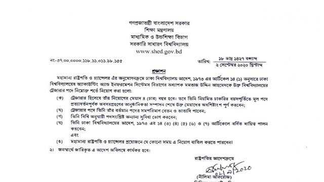 ঢাকা বিশ্ববিদ্যালয়ের ট্রেজারার হলেন অধ্যাপক মমতাজ উদ্দিন