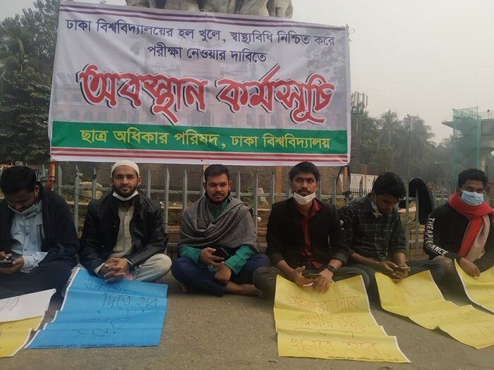 আবাসিক হল খুলে পরীক্ষা নেওয়াসহ কয়েকদফা দাবিতে আন্দোলন শুরু করেছেন ঢাকা বিশ্ববিদ্যালয়ের শিক্ষার্থীরা। বিশ্ববিদ্যালয়ের রাজু ভাস্কর্যের পাদদেশে আজ বুধবার (২৩ ডিসেম্বর) সকাল থেকে এ আন্দোলন শুরু করেন তারা। এসময় পরীক্ষার সময় স্বাস্থ্যবিধি নিশ্চিত করারও দাবি জানান তারা।