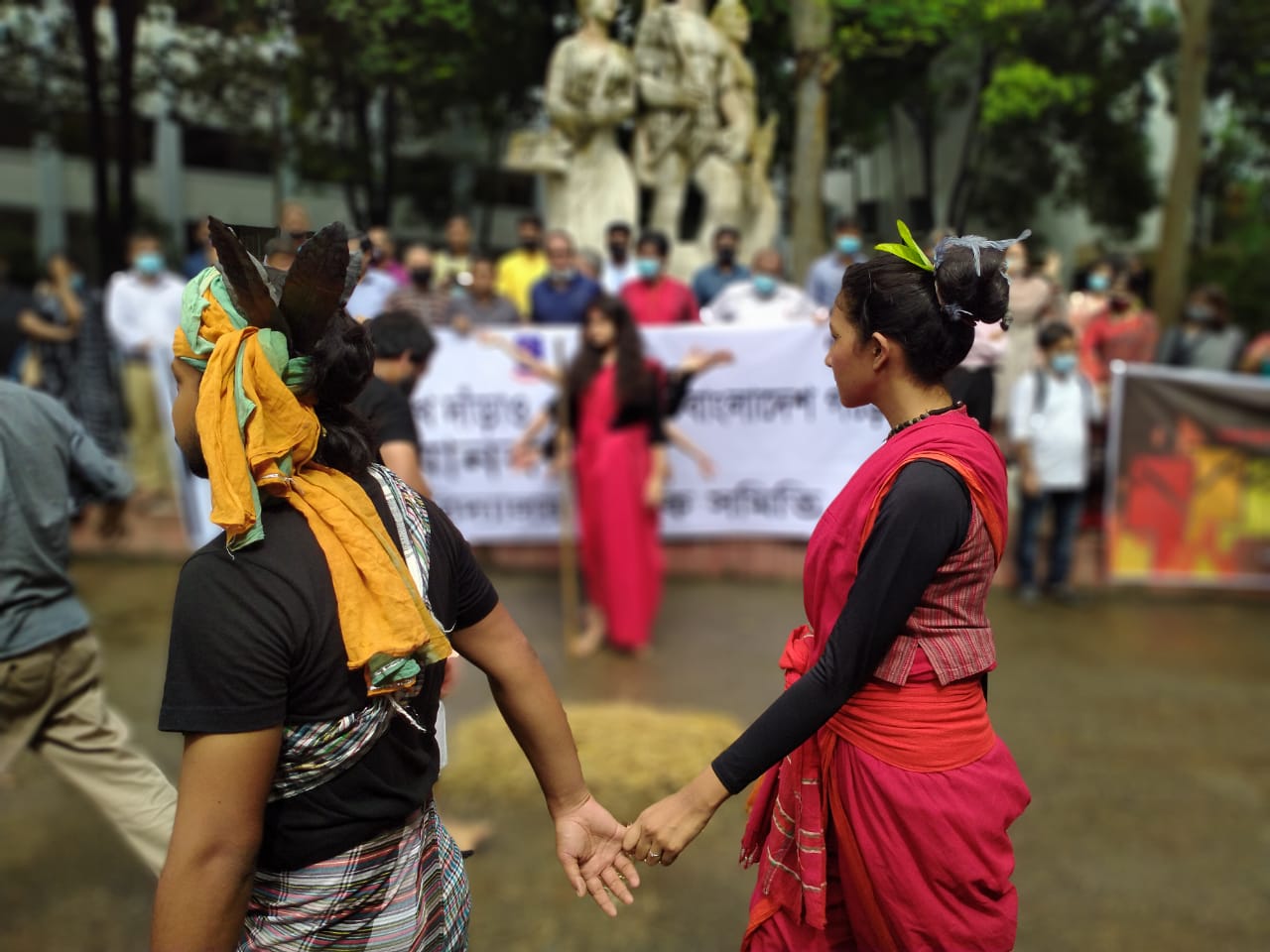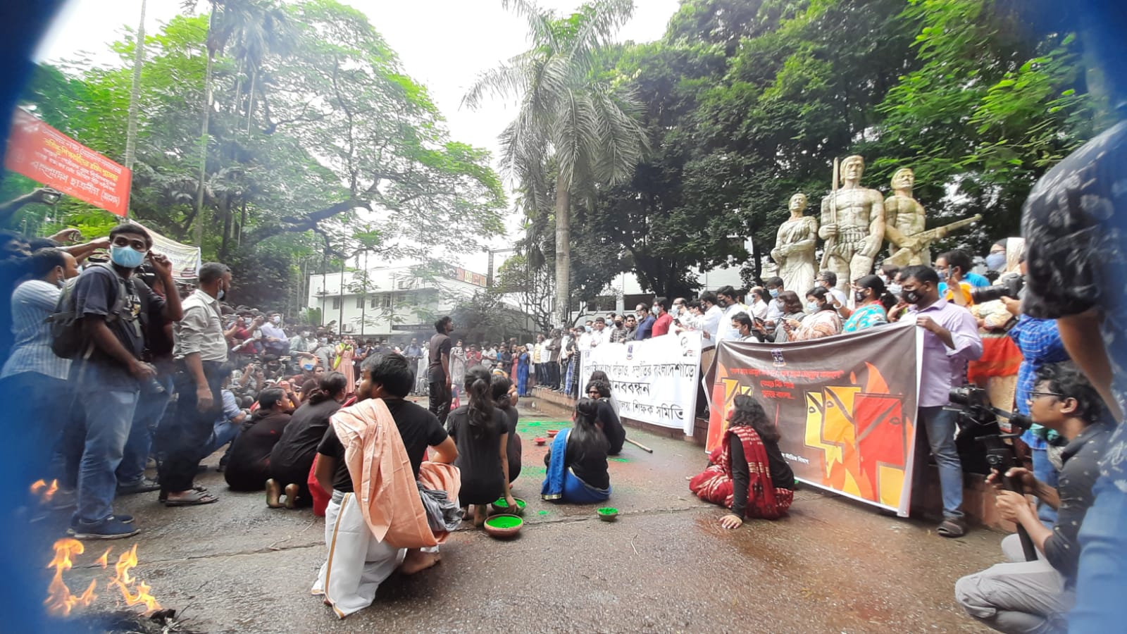 সদ্য সমাপ্ত হওয়া শারদীয়া দূর্গোৎসবের সময় সারাদেশে সনাতন ধর্মাবলম্বীদের বসতবাড়িতে অগ্নিসংযোগ ও নির্যাতনের প্রতিবাদে ‘শৈল্পিক’ প্রতিবাদ সমাবেশ করেছে ঢাকা বিশ্ববিদ্যালয়ের থিয়েটার এন্ড পারফরম্যান্স স্টাডিজ বিভাগ।