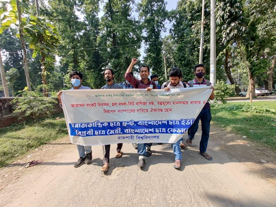আবাসিক হলগুলোতে ছাত্রলীগের দখলদারিত্ব ও সিট বাণিজ্য বন্ধের দাবিতে বিক্ষোভ করেছে রাজশাহী বিশ্ববিদ্যালয়ের প্রগতিশীল ছাত্র সংগঠনগুলো।