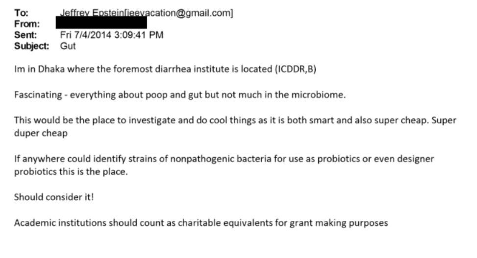 অন্যদিকে এপস্টেইনের ইমেল এবং প্রকল্প প্রস্তাবে দেখা যায়, তিনি বাংলাদেশে অবস্থিত একটি বিশ্বখ্যাত আন্তর্জাতিক স্বাস্থ্য গবেষণা প্রতিষ্ঠান আইসিডিডিআরবিকে (icddr,b) নিয়ে বিশেষ আগ্রহী ছিলেন। একটি ইমেলে প্রতিষ্ঠানটিকে ‘বিশ্বখ্যাত’ এবং ‘মল বা অন্ত্রের অণুজীব গবেষণায় বিশ্ব বিশেষজ্ঞ’ হিসেবে উল্লেখ করা হয়েছে।