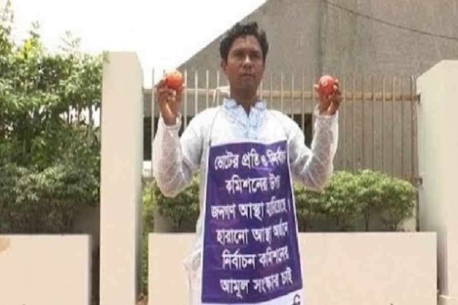 এক যুবক দাঁড়িয়ে আছেন নির্বাচন কমিশনের সামনে, দুই হাতে দুটি পচা আপেল নিয়ে। বৃহস্পতিবার সকালে রাজধানীর নির্বাচন কমিশন কার্যালয়ের সামনে চোখে পড়ে এ দৃশ্য। ওই যুবকের নাম হানিফ।