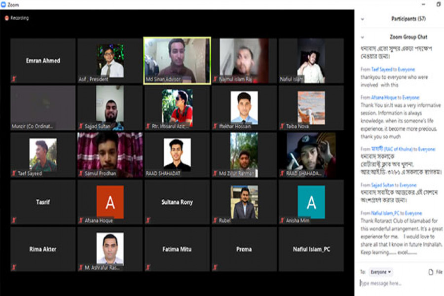 চাকরি জীবনের নানাবিধ সমস্যা ও তার সমাধান নিয়ে "স্টামবলিং ব্লকস ইন ক্যারিয়ার: ইনার টার্ন টু বি বেস্ট" শীর্ষক ওয়েবিনার অনুষ্ঠিত হয়েছে। আজ শনিবার (৯ মে) দুপুরে রোটার‍্যাক্ট ক্লাব অব ইসলামাবাদের উদ্যোগে অনলাইন মিটিং প্লাটফর্ম "জুম" এটি অনুষ্ঠিত হয়। এতে সেশন স্পিকার হিসেবে অংশগ্রহণ করেন স্যামসং আর এন ডি ইনস্টিটিউট বাংলাদেশ এর এইচ আর প্রফেশনাল নাফিউল ইসলাম।