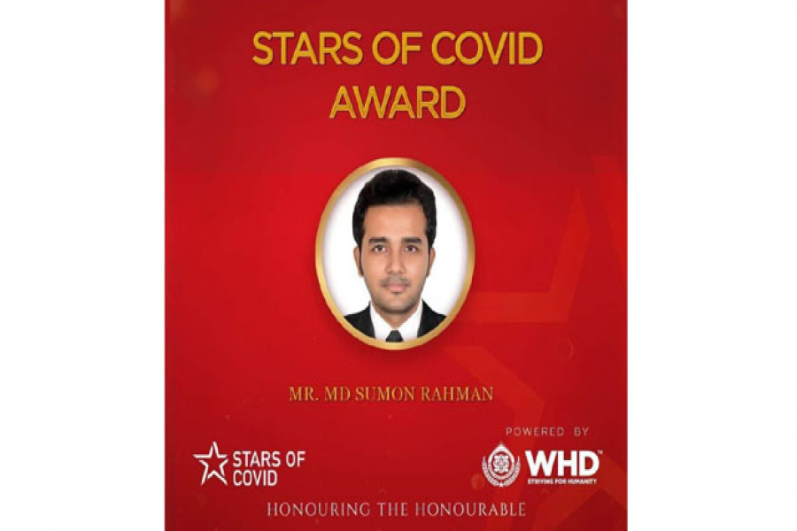 নভেল করোনাভাইরাস মোকাবেলায় মানবিক কাজের স্বীকৃতিস্বরুপ ‘স্টারস অফ কোভিড অ্যাওয়ার্ড’ পেলেন বাংলাদেশের যুব সংগঠক ও ময়ূরপঙ্খী সংস্থার প্রতিষ্ঠাতা চেয়ারম্যান মোঃ সুমন রহমান (রুহিত সুমন)। ওয়ার্ল্ড হিউম্যান ড্রাইভ (ডব্লিউএইচডি), ইউকে এর পক্ষ থেকে সারাবিশ্ব থেকে বাছাই প্রক্রিয়ার মাধ্যমে ৪০ জন করোনা যোদ্ধাকে এই আন্তর্জাতিক পুরস্কারে ভূষিত করেন।