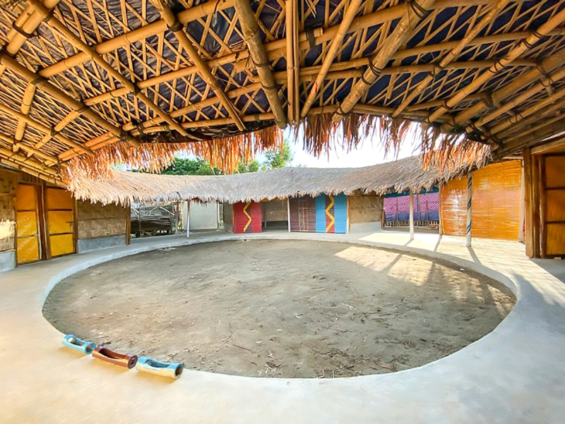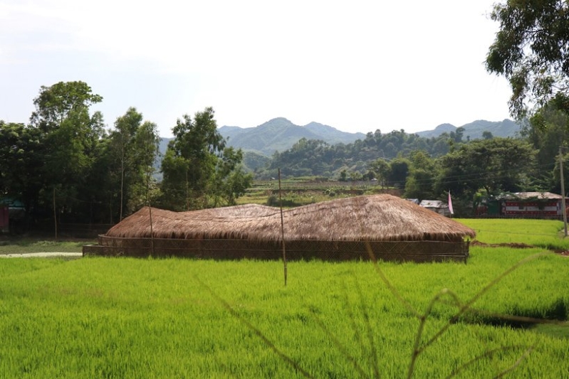রিজভীর নকশায় গড়া কক্সবাজারের টেকনাফ উপজেলার আলুখালী শরণার্থীশিবিরের একটি কমিউনিটি সেন্টার। দেখতে খুদে স্টেডিয়ামের মতো। গ্যালারির তো অংশটি ঘর। মাঝে ছোট খোলা আঙিনা। বাঁশের কাঠামোতে তৈরি ঘরের ছাউনি শণের। ঘরের ভেতরে রংবেরঙের নকশা। পাটি বিছিয়ে একদল কিশোরী হাতে–কলমে প্রশিক্ষণ নিচ্ছে। একটি ঘরে কয়েকজন নারী সেলাই মেশিন চালাচ্ছেন।