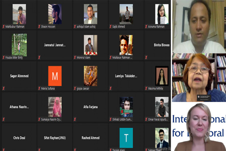 ওয়েবিনারে বক্তব্য দেন, অক্সফোর্ড বিশ্ববিদ্যালয়ের অধ্যাপক ড. এন্ডি ম্যাককেই, কলম্বিয়া বিশ্ববিদ্যালয়ের সাবেক অধ্যাপক ড. রওনক জাহান, বাংলাদেশ এন্টারপ্রাইজ ইনস্টিটিউটের ভারপ্রাপ্ত সভাপতি এম্বাসেডর হুমায়ুন কবির, ঢাকা বিশ্ববিদ্যালয়ের সামাজিক বিজ্ঞান অনুষদের ডীন অধ্যাপক ড. সাদেকা হালিম, ইন্টারন্যাশনাল ফাউন্ডেশন ফর ইলেক্ট্ররাল সিস্টেম এর এশিয়া প্যাসিপিক এর রিজিওনাল ডিরেক্টর ভাসু মোহন, সংগঠনটির বাংলাদেশ ও শ্রীলংকার কান্ট্রি ডিরেক্টর সিলজা প্যাসিলিনা প্রমুখ।