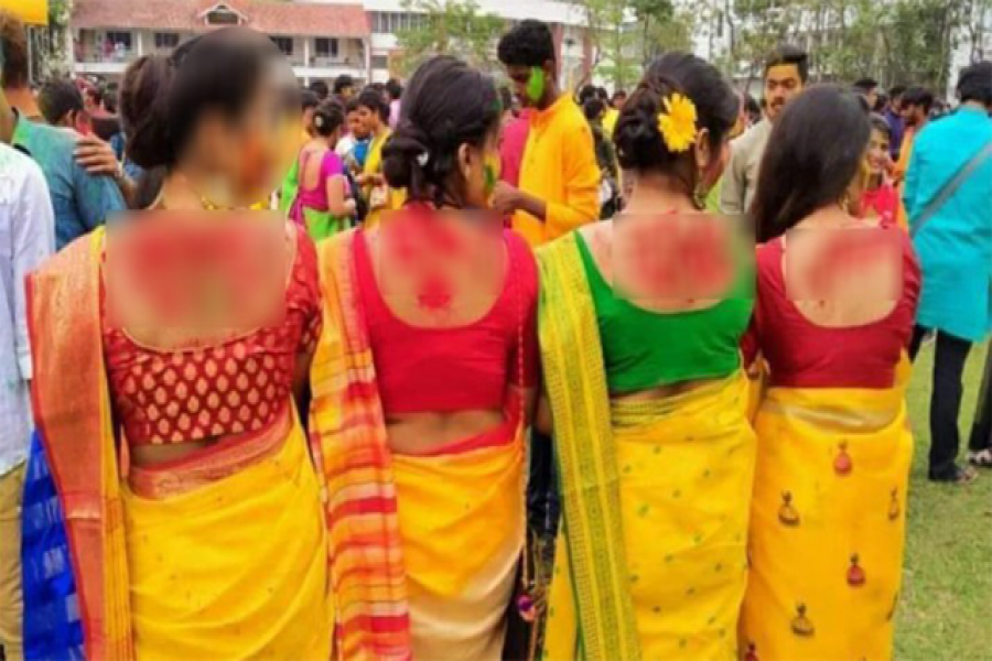 ছবিগুলিতে দেখা গিয়েছে, শাড়ি পরা কিছু মহিলার খোলা পিঠে আবির দিয়ে রবীন্দ্রনাথ ঠাকুরের গান বিকৃত করে অশ্লীল শব্দ লেখা রয়েছে। অশ্লীল শব্দ লেখা রয়েছে ছেলেদের বুকেও।