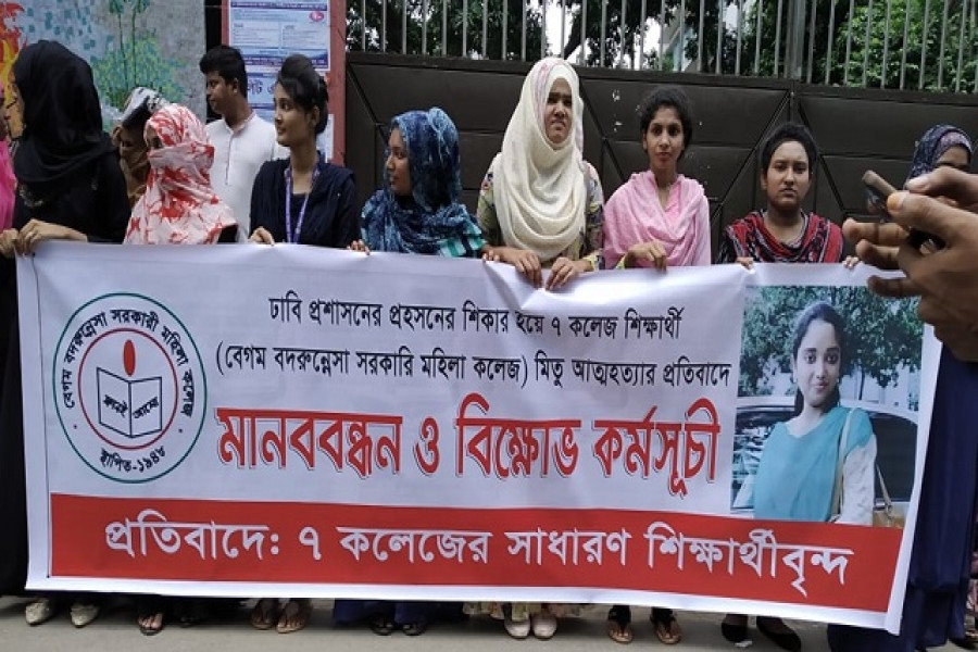 ঢাকা বিশ্ববিদ্যালয় (ঢাবি) অধিভুক্ত বেগম বদরুন্নেছা সরকারি মহিলা কলেজের ছাত্রীর আত্মহত্যার ঘটনায় আন্দোলনে নেমেছে তার সহপাঠীরা। শুক্রবার কলেজটির সামনে মানববন্ধনে শামিল হয়েছে সাত কলেজের ছাত্র-ছাত্রীরা।