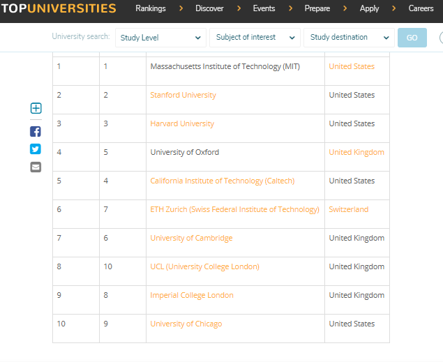 বিগত বছরগুলোর মতো এবারও তালিকার শীর্ষে রয়েছে ম্যাসাচুসেটস ইন্সটিটিউট অব টেকনোলজি (এমআইটি)। এ নিয়ে আট বছর ধরে প্রথমস্থান ধরে রেখেছে বিশ্ববিদ্যালয়টি। তালিকায় দ্বিতীয় অবস্থানে স্ট্যানফোর্ড ইউনিভার্সিটি এবং তৃতীয় অবস্থানে রয়েছে হার্ভাড বিশ্ববিদ্যালয়।