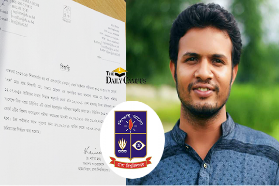 আইন বিভাগের চেয়ারম্যান ড. নাইমা হক স্বাক্ষরিত এক বিজ্ঞপ্তিতে বলা হয়, ২০১৭-১৮ শিক্ষাবর্ষের তৃতীয় বর্ষ এলএলবি (সম্মান) কোর্স ফাইনাল পরীক্ষায় ৩০১ ও ৩০২ নং কোর্সে ‘এফ’ গ্রেডপ্রাপ্ত শিক্ষার্থী মো. সাদ্দাম হোসেনের অবগতির জন্য জানানো যাচ্ছে যে, ডিনস কমিটির সভার সিদ্ধান্ত অনুযায়ী প্রতি কোর্সে ১০ হাজার টাকা জরিমান প্রদান সাপেক্ষে নিজ খরচে উল্লেখিত দুটি কোর্সের ফলোন্নয়ন পরীক্ষার অনুমতি দেওয়া হয়। উল্লেখিত ৩০১ ও ৩০২ নং কোর্সের বিশেষ ফলোন্নয়ন পরীক্ষা আগামী ৮ সেপ্টেম্বর ও ১১ সেপ্টেম্বর অনুষ্ঠিত হবে।