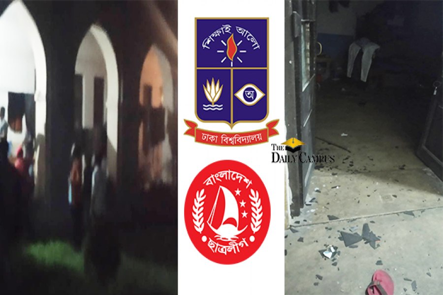 ঢাকা বিশ্ববিদ্যালয়ের (ঢাবি) সলিমুল্লাহ মুসলিম হলের কয়েকটি রুমে এলোপাতাড়ি হামলা চালিয়েছে ছাত্রলীগের নেতা-কর্মীরা। এতে রুমের আসবাবপত্রসহ জানালা ভেঙে গেছে। এদিকে ডাকসু সদস্য রাকিবুল ইসলাম ঐতিহ্য এসে পরিস্থিতি নিয়ন্ত্রণে আনার চেষ্টা করছেন।