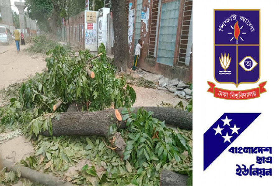 করোনাভাইরাসের কারণে লকডাউনে ক্যাম্পাস বন্ধ থাকার সুযোগ নিয়ে নির্বিচার গাছ কেটে ঢাকা বিশ্ববিদ্যালয় ক্যাম্পাসের প্রাণ-প্রকৃতি ধ্বংস করছে স্বার্থান্বেষী প্রশাসন বলে অভিযোগ তুলেছে ছাত্র ইউনিয়ন। এর প্রতিবাদে আজ (১৮ মে) বেলা ১১টার দিকে বাংলা একাডেমির সামনে মানববন্ধন করেছেন সংগঠনটি। এই কর্মসূচিতে সামাজিক দূরত্ব কঠোরভাবে নিশ্চিত করা হয় বলে ছাত্র ইউনিয়নের এক প্রেস বিজ্ঞপ্তিতে জানানো হয়েছে।