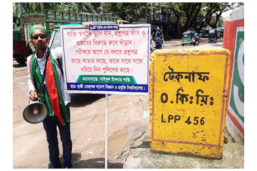 সাম্প্রতিক সময়ের বিভিন্ন গুজবের বিরুদ্ধে জনসচেতনতা সৃষ্টি করতে নিজের পকেটের টাকায় বাংলাদেশের সর্ব উত্তরের জেলা পঞ্চগড়ের তেঁতুলিয়ার তেঁতুল তলা থেকে গত রবিবার (২১ জুলাই) সকাল ৬ টায় পায়ে হেঁটে টেকনাফের উদ্দেশ্যে পদযাত্রা শুরু করেন হাজী মোহাম্মদ দানেশ বিজ্ঞান ও প্রযুক্তি বিশ্ববিদ্যালয়ের মার্কেটিং বিভাগের শেষবর্ষের শিক্ষার্থী সাইফুল ইসলাম শান্তি।