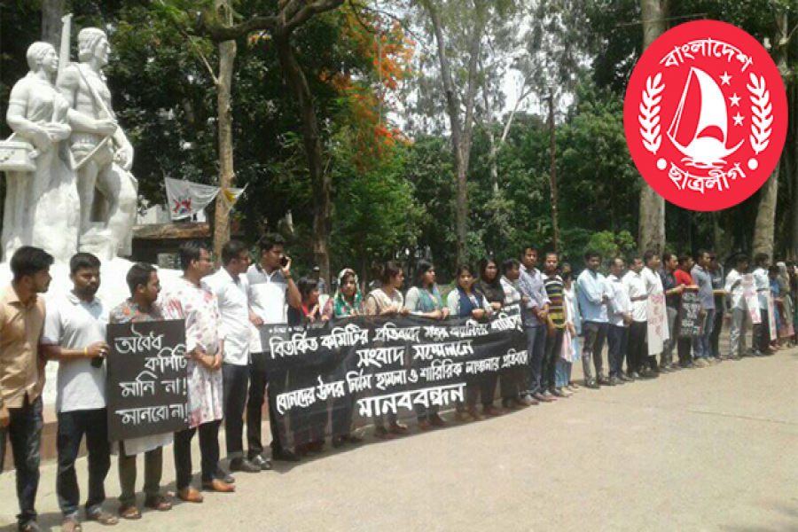 সদ্য ঘোষিত কেন্দ্রীয় পূর্ণাঙ্গ কমিটি বাতিল এবং মধুর ক্যান্টিনে সংগঠনের নারী নেত্রীদের উপর হামলার প্রতিবাদে মানববন্ধন করেছেন ছাত্রলীগের পদ বঞ্চিতরা। বুধবার দুপুরে ঢাকা বিশ্ববিদ্যালয়ের অপরাজেয় বাংলার পাদদেশে এ মানববন্ধনের আয়োজন করা হয়। এসময় মধুর ক্যান্টিনে ছাত্রলীগের নারী নেত্রীদের উপর হামলাকে ছোট ঘটনা বলায় আওয়ামী লীগ নেতাদের কড়া সমালোচনা করেন হামলার শিকার নেত্রীরা।