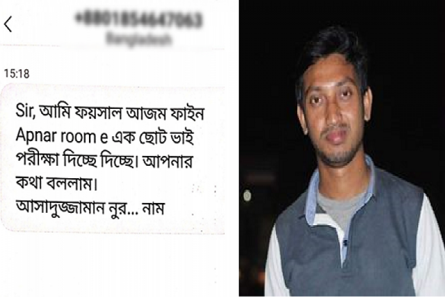 জানা যায়, বুধবার চতুর্থ শিফটে কবি হেয়াৎ মামুদ ভবনের ৪০৪ নম্বর রুমে পরীক্ষার দায়িত্ব পালনের সময় ওই শিক্ষককে মোবাইলে মেসেজ দেন ফয়সাল আজম ফাইন। তিনি একটি নম্বর থেকে শিক্ষকের ব্যক্তিগত মোবাইলে মেসেজে বলেন ‘স্যার, আমি ফয়সাল আজম ফাইন। আপনার রুমে এক ছোট ভাই পরীক্ষা দিচ্ছে। আপনার কথা বললাম। আসাদুজ্জামান নুর... নাম।’