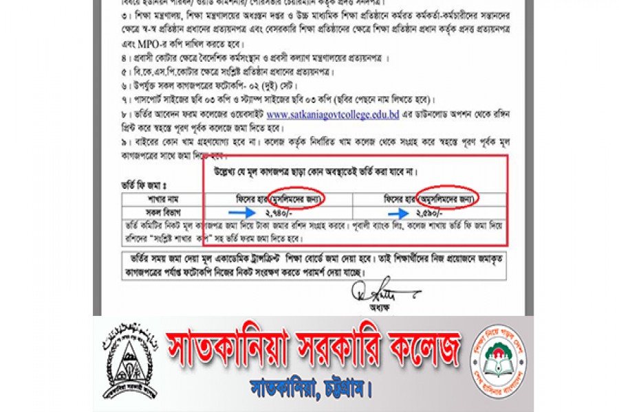 চট্টগ্রামের সাতকানিয়া কলেজের ২০১৯-২০ সেশনে একাদশ শ্রেণীর একটি ভর্তি বিজ্ঞপ্তি সামাজিক মাধ্যমে ভাইরাল হয়েছে। বিজ্ঞপ্তিতে দেখা যাচ্ছে, মুসলিম এবং অমুসলিম শিক্ষার্থীদের জন্য আলাদা ফি নির্ধারণ করেছে কলেজ কর্তৃপক্ষ। মুসলিম শিক্ষার্থীদের জন্য ভর্তি ফি ২৭৪০ টাকা আর অমুসলিম শিক্ষার্থীদের ভর্তি ফি ২৫৯০ টাকা। অর্থাৎ, ১৫০ টাকা বেশি দিতে হচ্ছে মুসলিম শিক্ষার্থীদেরকে।