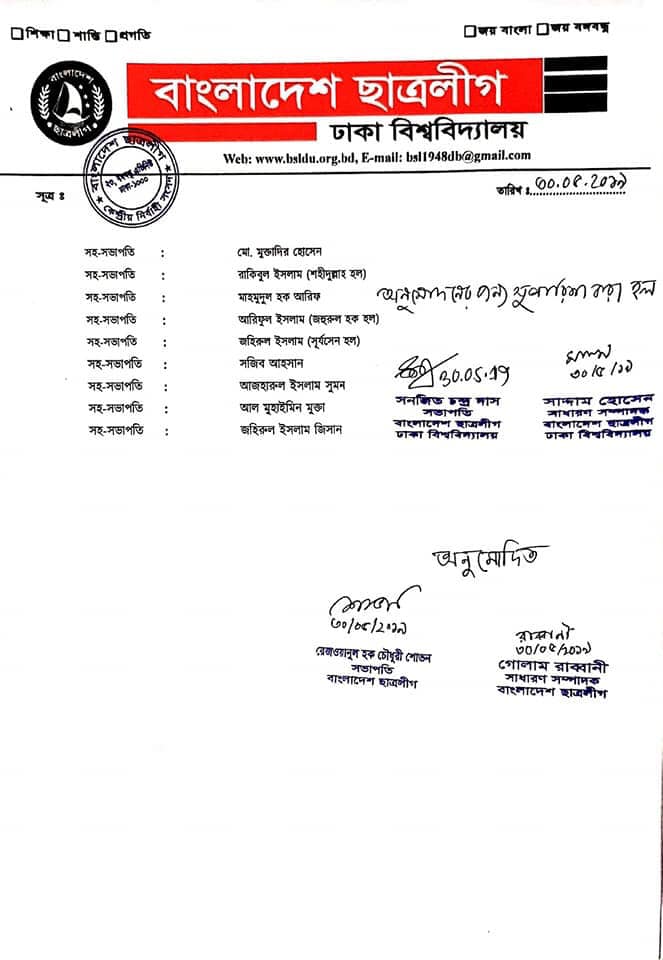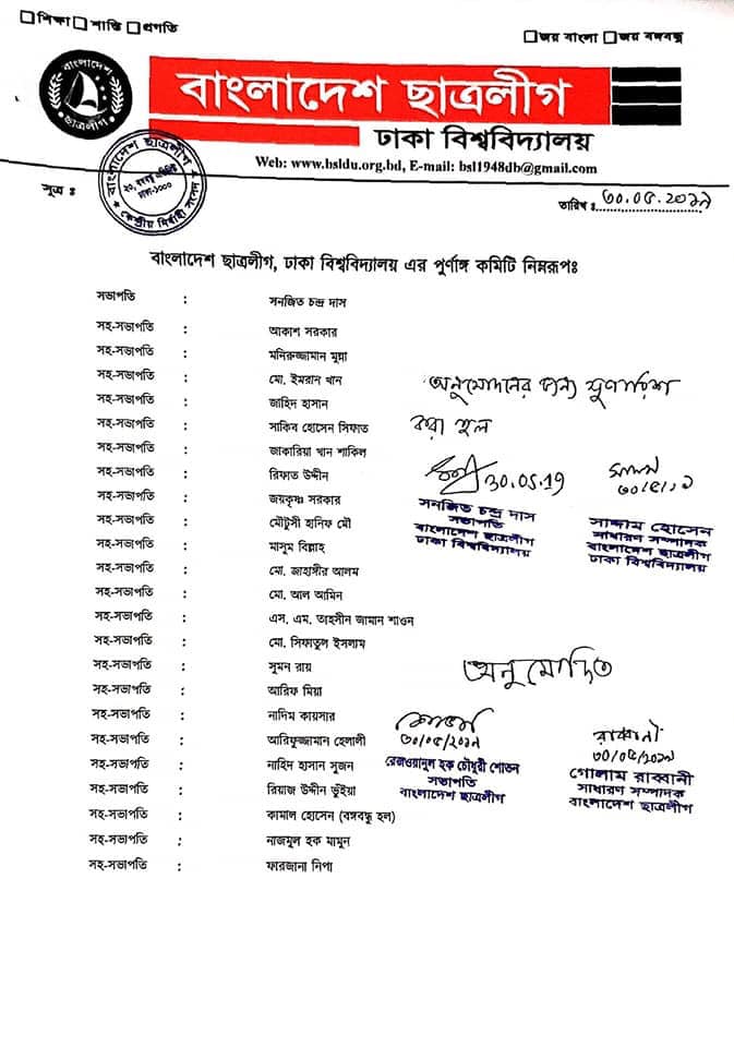 ঢাকা বিশ্ববিদ্যালয় (ঢাবি) ছাত্রলীগের পূর্ণাঙ্গ কমিটি ঘোষণা করা হয়েছে। বৃহস্পতিবার এই কমিটি ঘোষণা করা হয়। এর আগে ঢাকা বিশ্ববিদ্যালয়ের সম্মেলন হয় ২৯ এপ্রিল। সম্মেলনের আড়াই মাস পর ৩১ জুলাই আওয়ামী লীগ সভানেত্রী ও প্রধানমন্ত্রী শেখ হাসিনার ওপর অর্পিত ক্ষমতাবলে কেন্দ্রীয় কমিটির সঙ্গে ঢাকা বিশ্ববিদ্যালয়ের কমিটিও অনুমোদন করেন। এতে সঞ্জিত চন্দ্র দাসকে সভাপতি ও সাদ্দা হোসেনকে সাধারণ সম্পাদক নির্বাচিত হন। মূলত ওই কমিটির দীর্ঘদিন পর পূর্ণাঙ্গ কমিটি ঘোষিত হলো; যা বিশ্ববিদ্যালয় সভাপতি ও সাধারণ সম্পাদকের সুপারিশের প্রেক্ষিতে কেন্দ্রীয় সভাপতি রেজওয়ানুল হক চৌধুরী শোভন ও সম্পাদক গোলাম রাব্বানী অনুমোদন দেন।