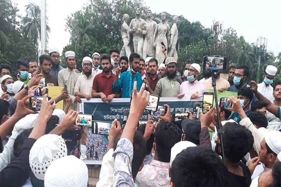 আজ বৃহস্পতিবার শিক্ষাপ্রতিষ্ঠানে সরকারদলীয় প্রভাব মুক্ত রাখার জন্য এবং হাটহাজারী মাদ্রাসার ছাত্রদের আন্দোলনের প্রতি সমর্থন জানিয়ে ‘ঢাকা বিশ্ববিদ্যালয়ের শিক্ষার্থী’ ব্যানারে আয়োজিত এক মানববন্ধনে তিনি এসব কথা বলেন।
